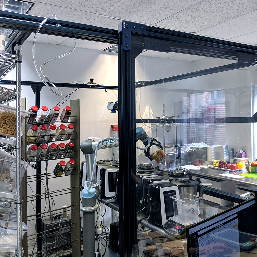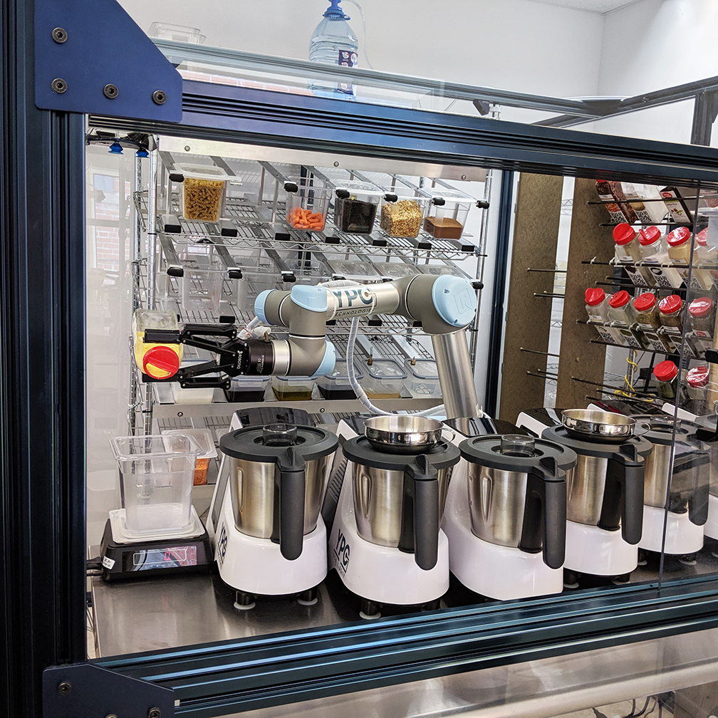 해당 솔루션은 UR5 로봇과 머신비전 등을 활용하여 주문 입력된 음식을 조리 순서에 맞춰 조리 작업을 수행하는 공정입니다.