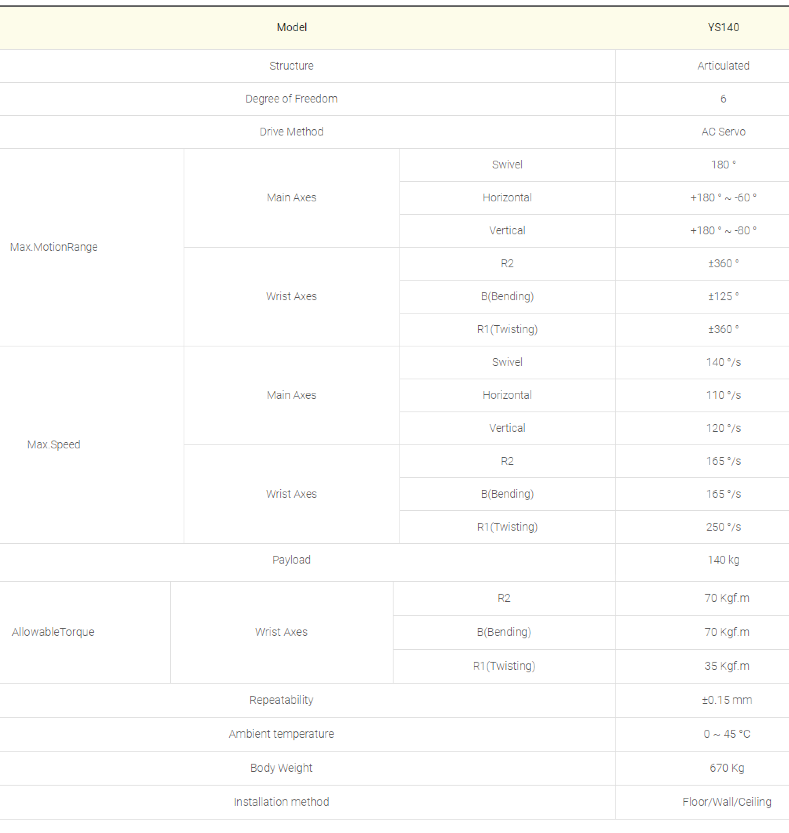 | 상품명(모델명) | 현대로보틱스 YS140 (Pay load : 140kg Reach : 2,339mm) | ||