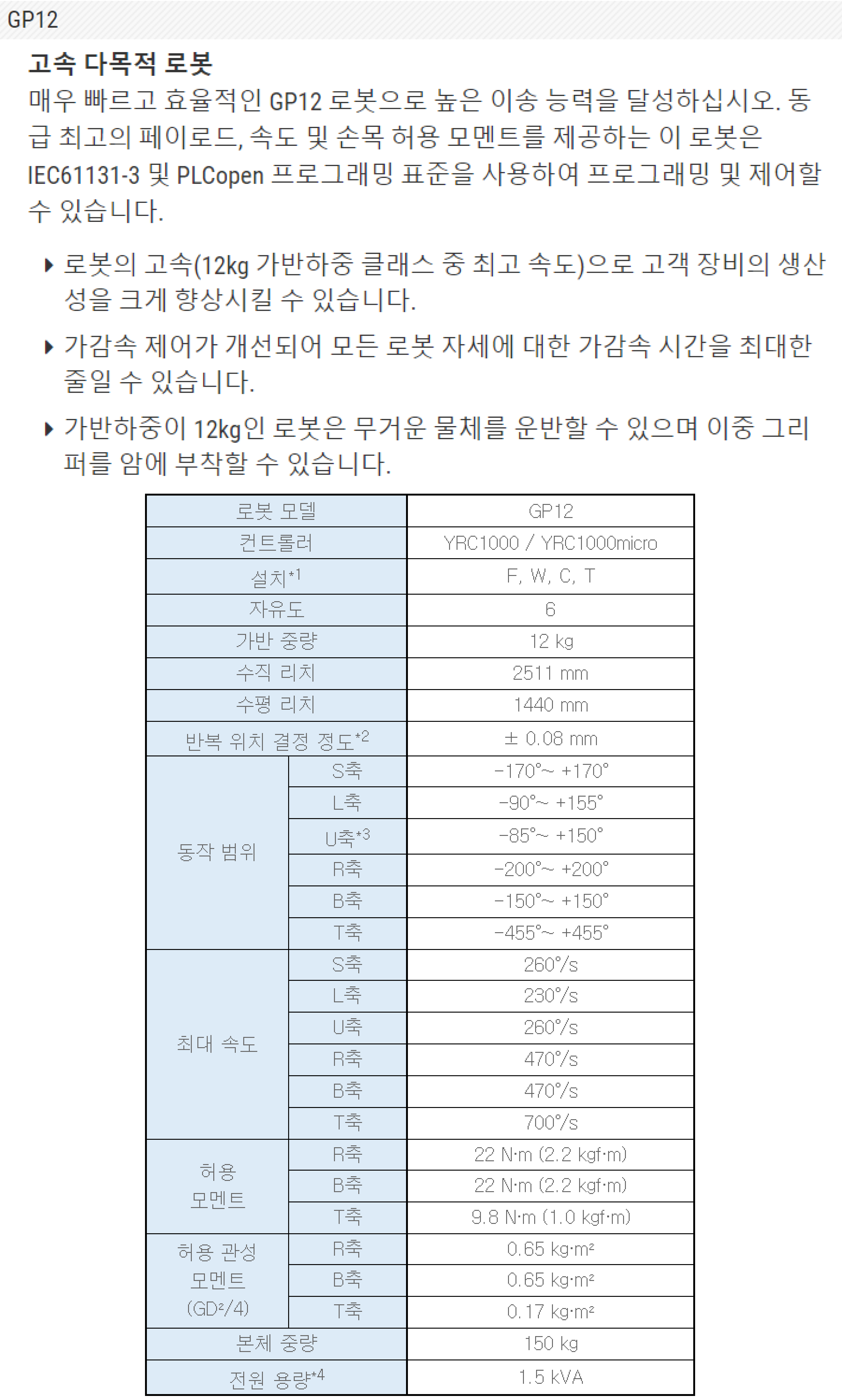 | 상품명(모델명) | YASKAWA GP12 (Payload : 12kg, Reach : 2511mm) | ||
