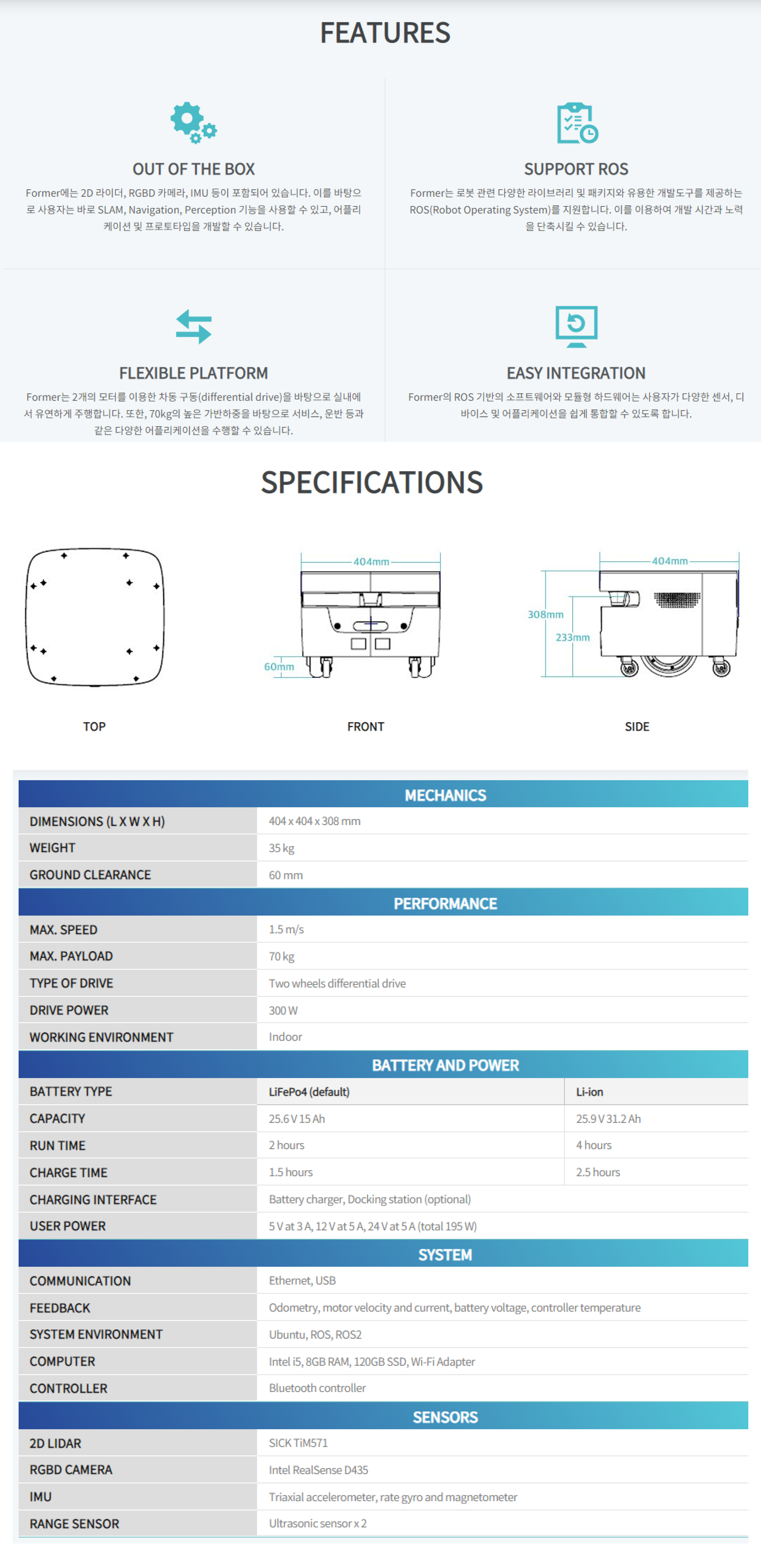 | 상세스펙 | 모바일로봇 최고속도 1.5m/s 가용시간 4시간 충전시가나 2.5시간 충전방식 자동 중량 35kg 최저지상높이 60mm | ||