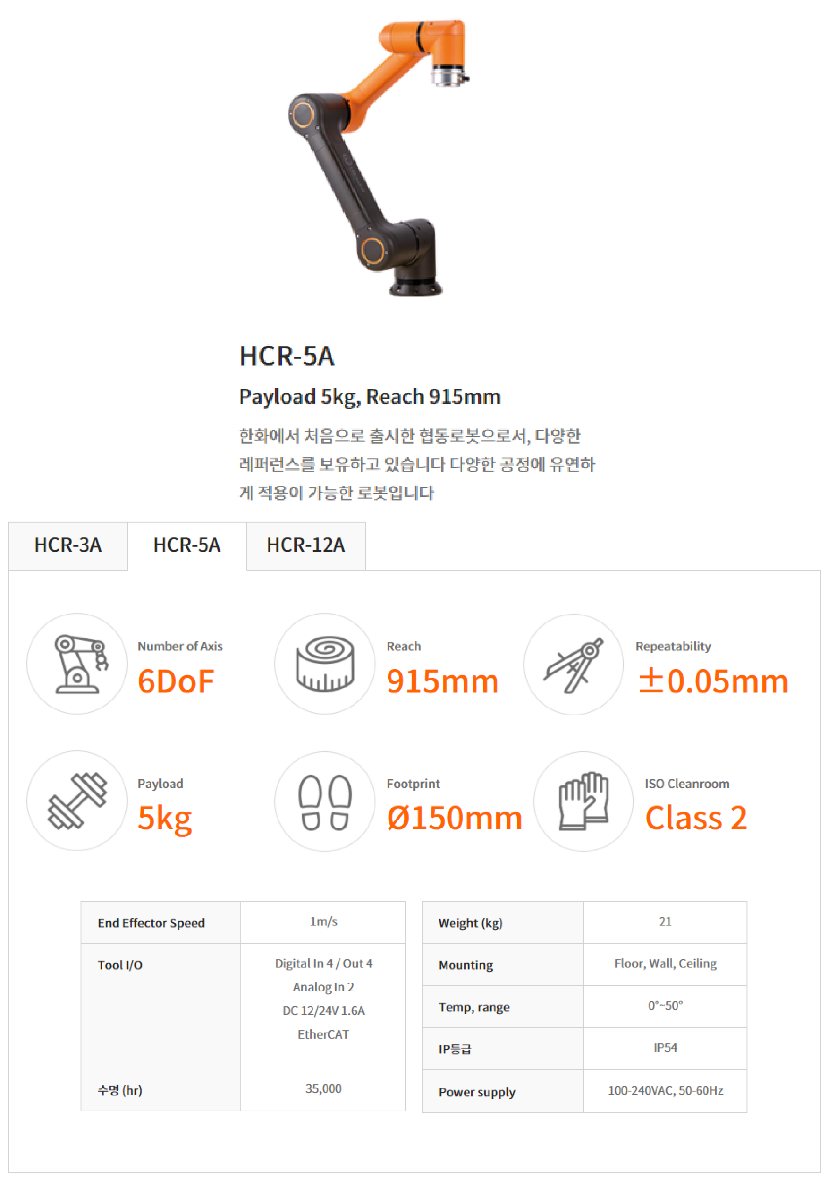| 상품명(모델명) | 한화기계 HCR-5A (Pay load : 5kg Reach : 915 mm) | ||