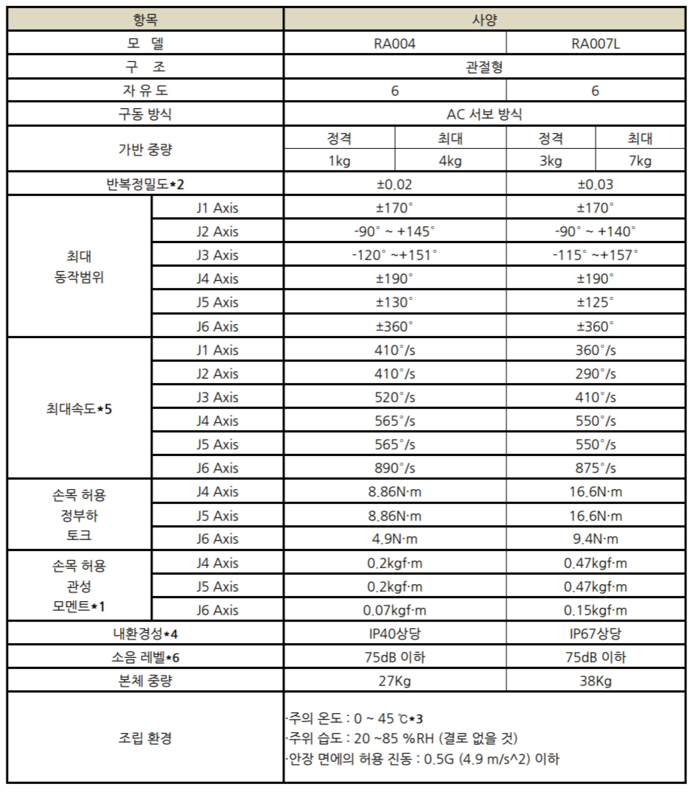 | 상품명(모델명) | 로보스타 RA007 (Payload : 7kg, Reach : 930mm) | ||