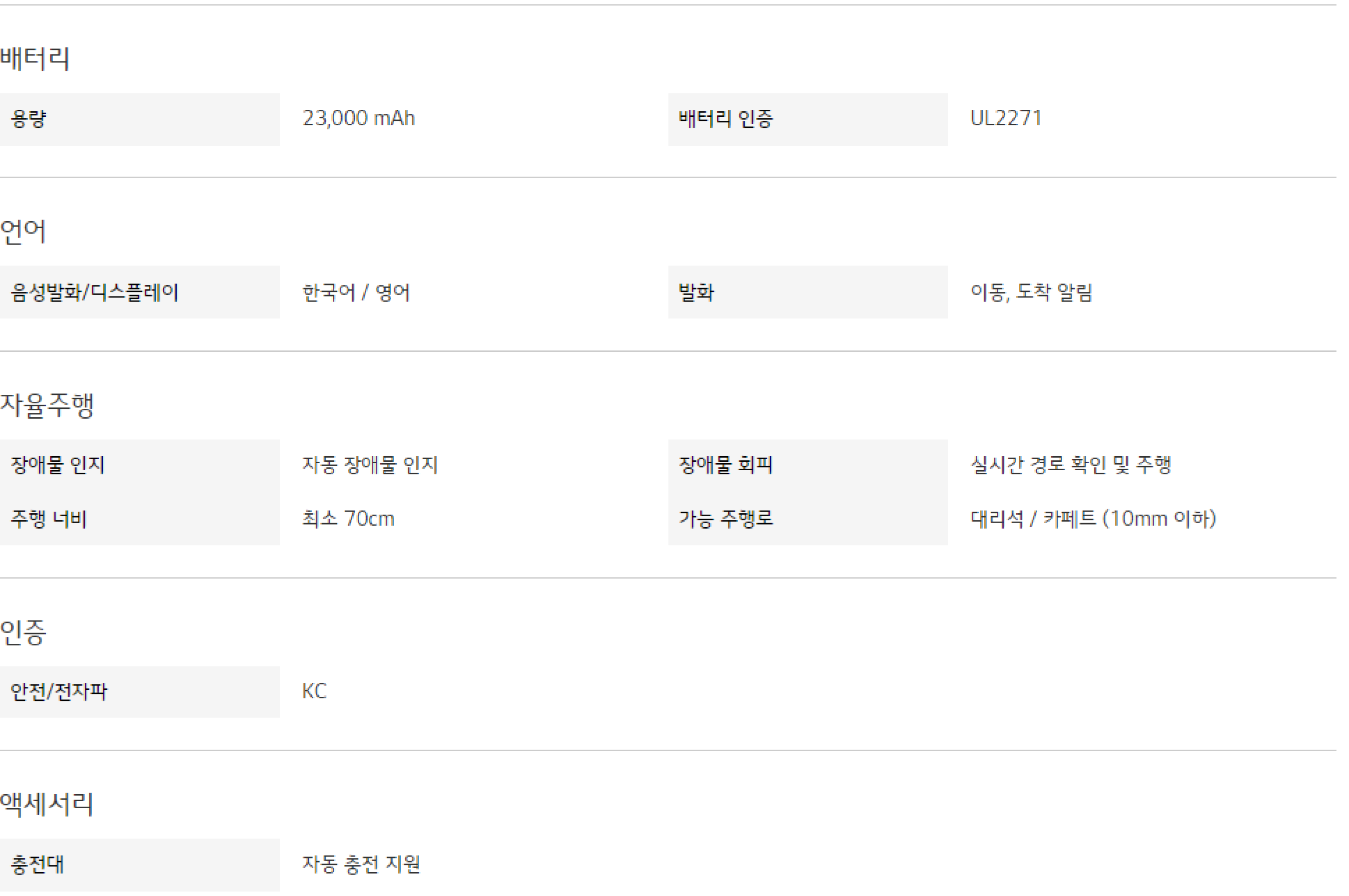 | 상세스펙 | 표준 서랍 사이즈 330mm * 260mm * 150mm 큰 서랍 사이즈 330mm * 260mm * 350mm 표준 서랍 가반하중 15kg(5kg * 3) 큰 서랍 가반하중 17kg 충전시간 2.5시간 가용시간 5시간 최고속도 1m/s 네트워크 LTE/BT | ||
