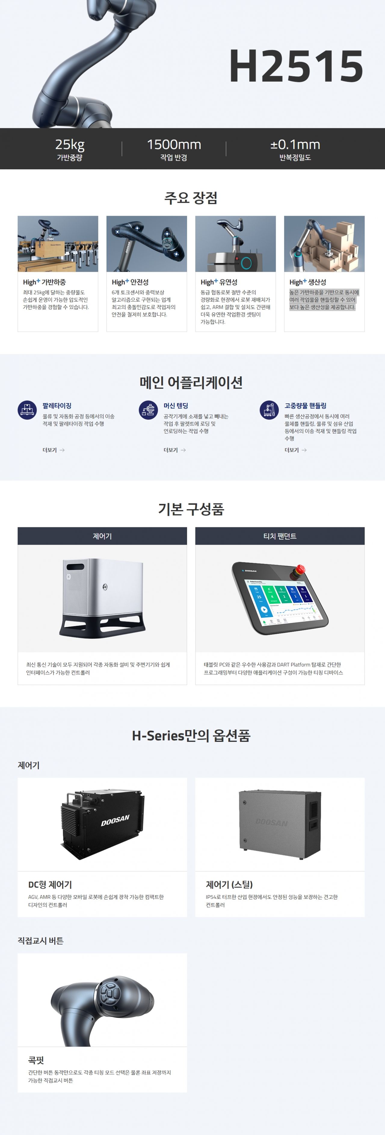 | 상품명(모델명) | [업계 최저가] 두산로보틱스 H2515 (Payload : 25kg, Reach : 1500mm) | ||